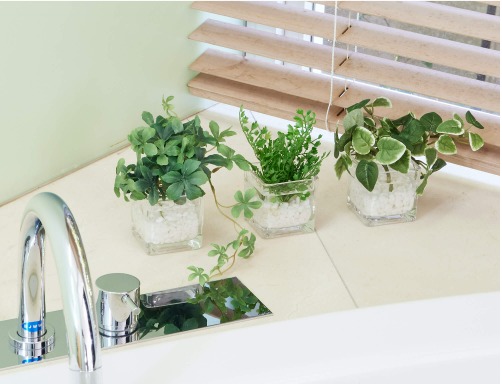 また、フェイクグリーンミニは、飾りやすいサイズなので、洗面所やトイレなどの水回り、デスクの上やデットスペースなど省スペースで飾ることができるので、室内に緑を取り入れて心地よい生活を送ってみませんか。