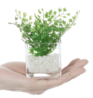 清潔感のあるキューブ型のガラスベースに、本物の水のようなフェイクウォーターで固めた涼しげなアレンジ、繊細な葉っぱが愛らしいアジアンタム、水草のような姿が爽やかなミリオン、濃く鮮やかなグリーンの葉が可愛らしいシュガーバインのウォーターセットです。